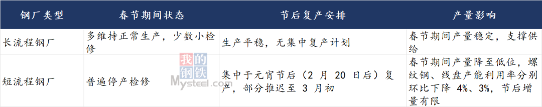 二、供應(yīng)情況:高爐電爐分化,節(jié)后復(fù)產(chǎn)節(jié)奏偏緩春節(jié)期間供應(yīng)呈現(xiàn)“高爐穩(wěn)產(chǎn)、電爐停產(chǎn)”的顯著分化特征,具體情況如下。