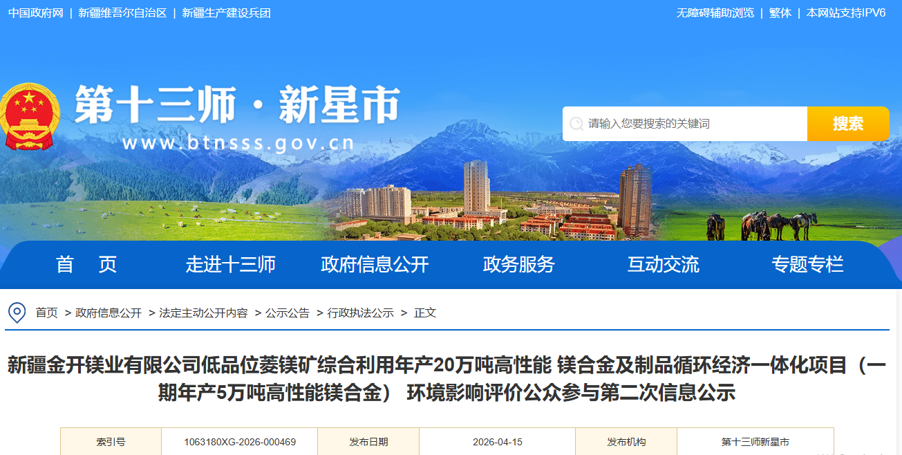 我公司委托新疆辰光啟航環(huán)保技術(shù)有限公司承擔(dān)了“新疆金開鎂業(yè)有限公司低品位菱鎂礦綜合利用年產(chǎn)20萬(wàn)噸高性能鎂合金及制品循環(huán)經(jīng)濟(jì)一體化項(xiàng)目(一期年產(chǎn)5萬(wàn)噸高性能鎂合金)”的環(huán)境影響評(píng)價(jià)工作?,F(xiàn)環(huán)境影響評(píng)價(jià)單位編制完成了《新疆金開鎂業(yè)有限公司低品位菱鎂礦綜合利用年產(chǎn)20萬(wàn)噸高性能鎂合金及制品循環(huán)經(jīng)濟(jì)一體化項(xiàng)目(一期年產(chǎn)5萬(wàn)噸高性能鎂合金)環(huán)境影響報(bào)告書》(征求意見稿),根據(jù)《中華人民共和國(guó)環(huán)境影響評(píng)價(jià)法》《環(huán)境影響評(píng)價(jià)公眾參與辦法》(生態(tài)環(huán)境部令第4號(hào))等法律法規(guī)及相關(guān)規(guī)定,現(xiàn)對(duì)該項(xiàng)目進(jìn)行公眾參與第二次信息公開,請(qǐng)社會(huì)公眾對(duì)該報(bào)告提出意見和建議。公示材料如下: